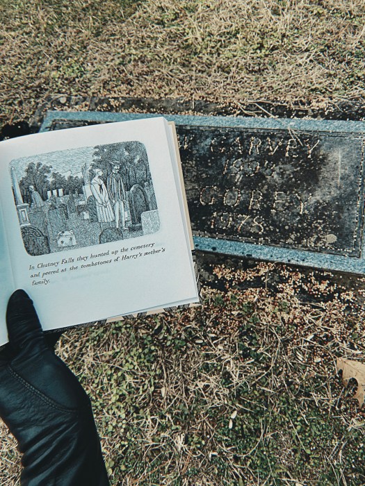 It was a dreary day in which a long, boring drive was taken. Without much else to do in the days after Christmas, a visit to a far-off cemetery wasn’t out of the question. A walk was taken and grim pleasantries were exchanged to pass the time. Little was needed to find the particular grave that was going to be visited because a rather large spider sat protecting it. Judging from the bird seed scattered atop it, a fair amount of crows also hovered near the plot in their spare time. The grave in question bears two names, but contains three souls. The unnamed one is Edward Gorey and today is his 100th birthday.